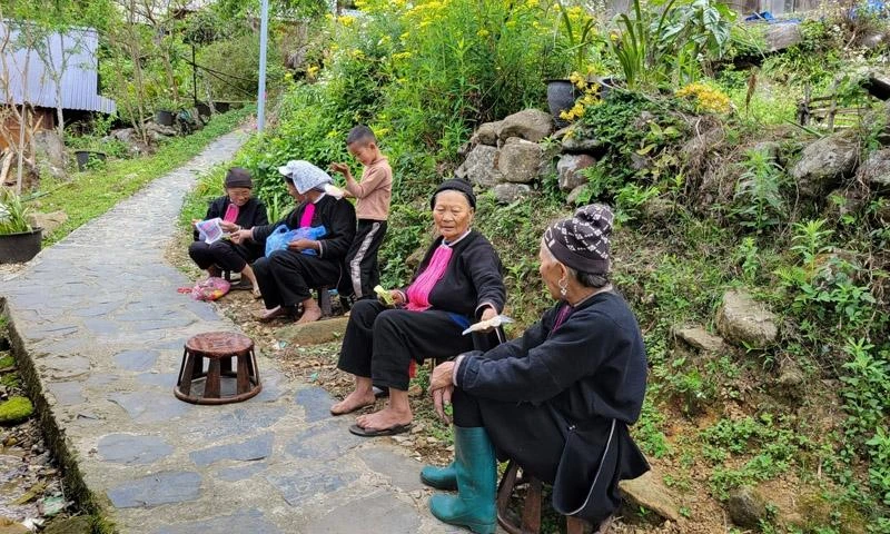 Lúc rảnh rỗi, các bà, các mẹ người Dao quây quần ngồi thêu thùa. Phụ nữ người Dao đều biết thêu trang phục cho chính mình.