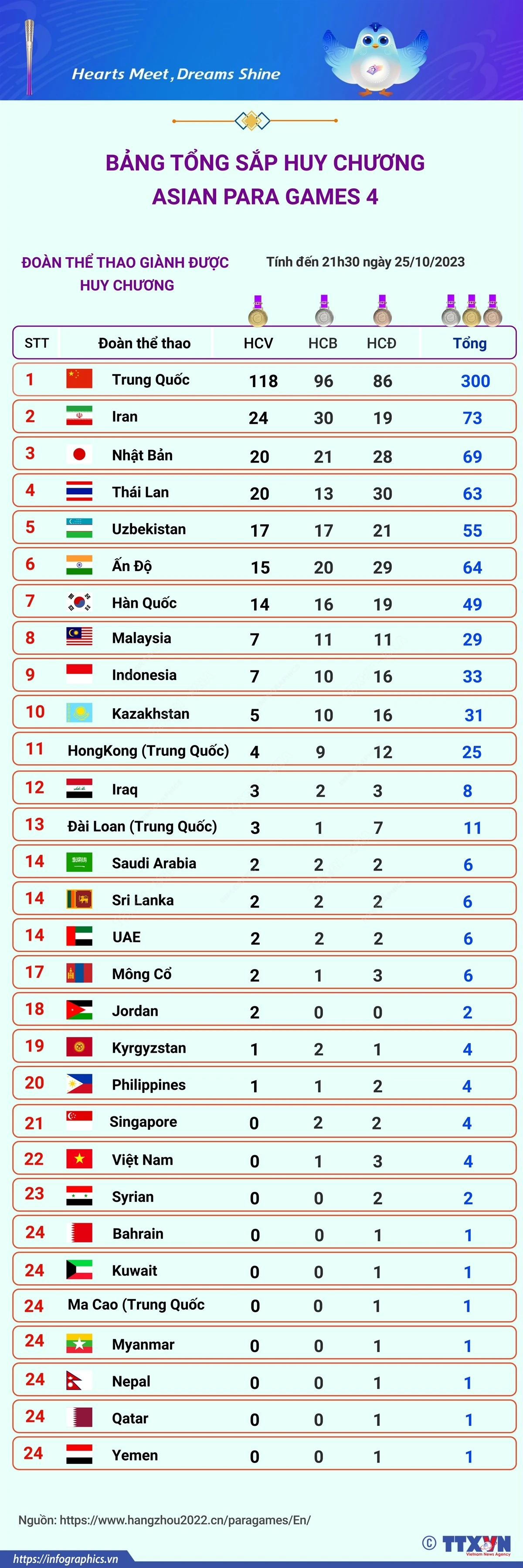 Đoàn Thể thao Người Khuyết tật Trung Quốc đang cho thấy sức mạnh vượt trội trên bảng tổng hợp thành tích thi đấu của Asian Para Games 4. Tính đến 21 giờ 30 (giờ Việt Nam) ngày 25/10/2023, Trung Quốc đang dẫn đầu bảng tổng sắp với 118 huy chương Vàng, 96 huy chương Bạc và 86 huy chương Đồng.