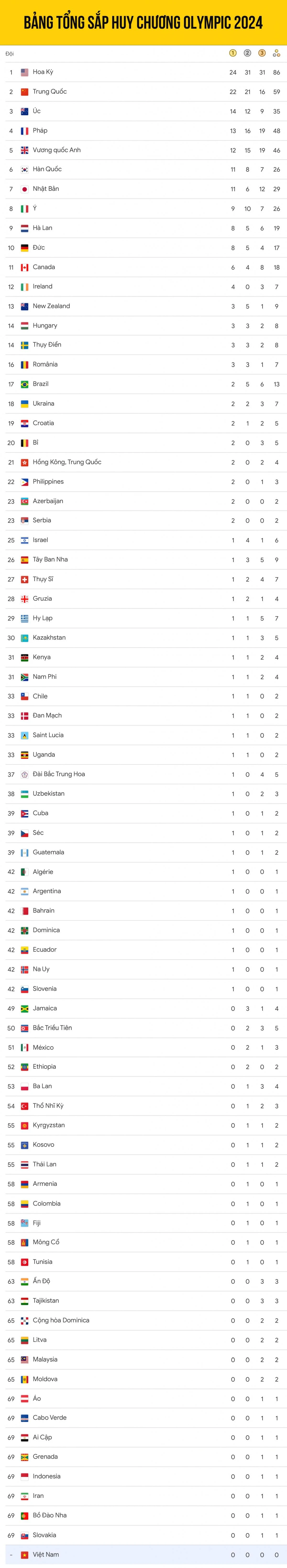 Theo bảng tổng sắp huy chương Olympic 2024 tính đến 7h ngày 6/8, Đoàn Thể thao Mỹ đã vươn lên dẫn đầu với 24 HCV, 31 HCB và 31 HCĐ. Đoàn Thể thao Trung Quốc đứng thứ 2 với 22 HCV, 21 HCB và 16 HCĐ, đứng thứ 3 là Australia với 14 HCV, 12 HCB và 9 HCĐ. Nước chủ nhà Pháp đang tạm xếp thứ 4 với 13 HCV, 16 HCB và 19 HCĐ. Hiện tại, Đoàn Thể thao Việt Nam vẫn chưa có được huy chương.