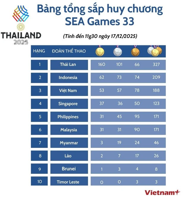 Cụ thể, tính đến 11g30 ngày 17/12, đoàn thể thao Việt Nam đã có được 53 huy chương Vàng, 57 huy chương Bạc và 78 huy chương Đồng.