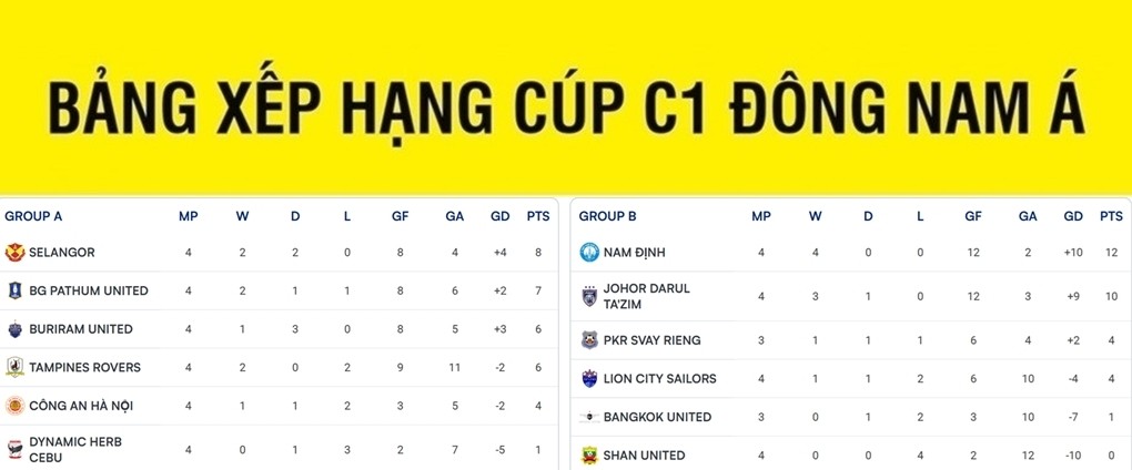 Bảng xếp hạng Cúp C1 Đông Nam Á mới nhất, cập nhật sáng 30/1. CLB Nam Định sớm giành quyền vào bán kết với thành tích vượt trội là bốn trận toàn thắng ở bảng B. Đội bóng thành Nam cũng là CLB đầu tiên ở hai bảng giành quyền vào bán kết.