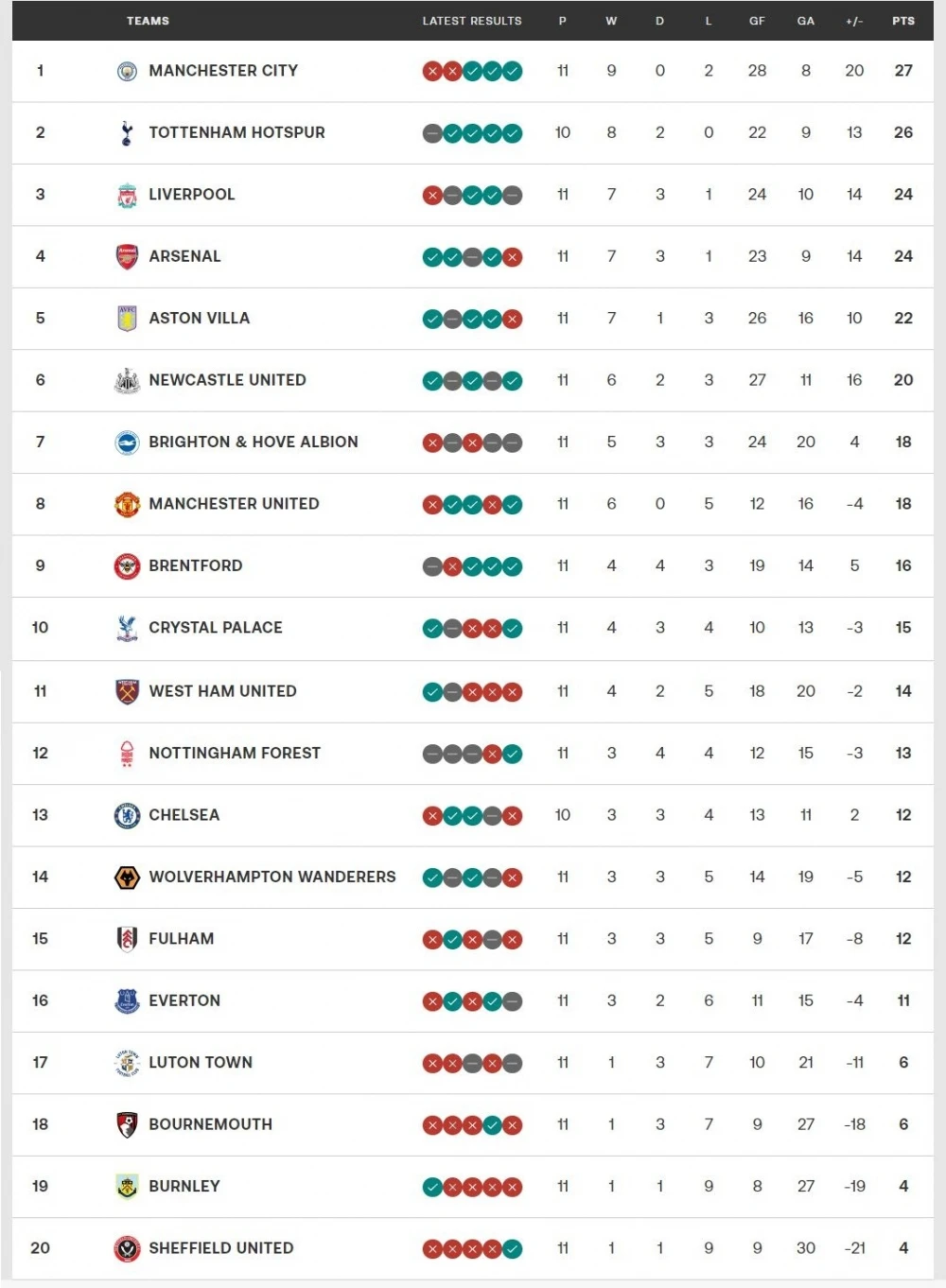 Bảng xếp hạng Ngoại hạng Anh mới nhất: Man City tạm dẫn đầu, Arsenal tụt hạng (Ảnh: Eurosport)
