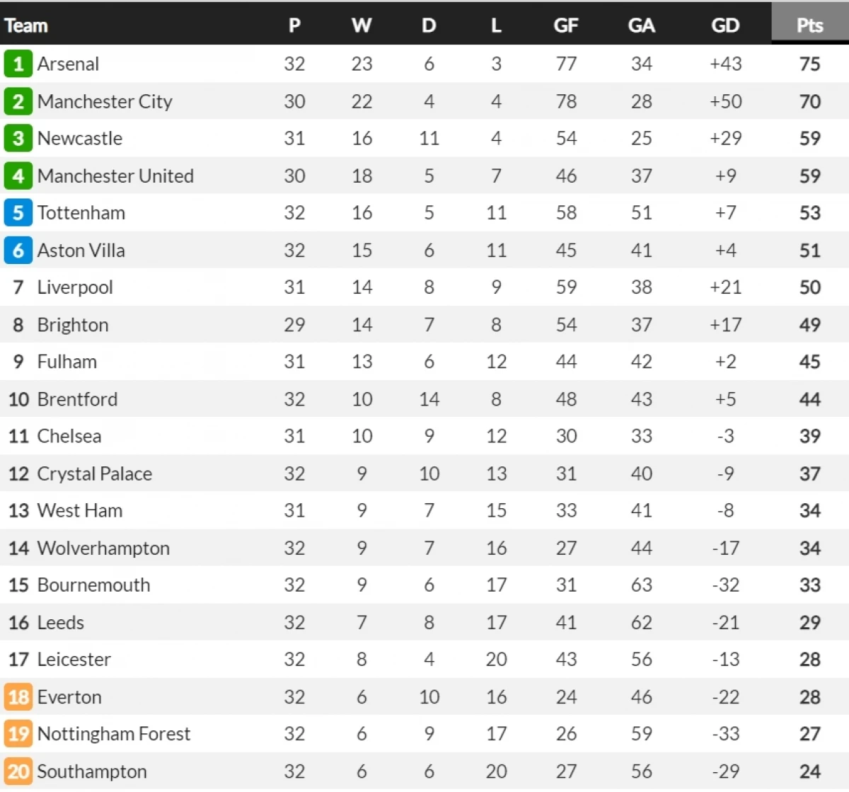 Sau chiến thắng 6-1 trước Tottenham, Newcastle có 59 điểm sau 31 trận và tạm chiếm vị trí thứ 3 Ngoại hạng Anh từ tay MU. Chích chòe hơn Quỷ đỏ về chỉ số phụ (hiệu số +29 so với +9), nhưng đá nhiều hơn 1 trận.