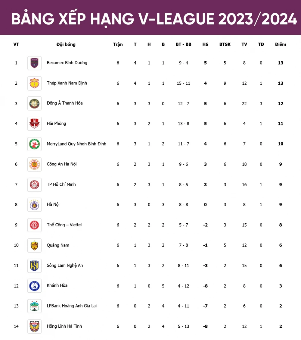 Cập nhật bảng xếp hạng V-League 2023/2024 sau vòng đấu thứ 6, cuộc đua vô địch đang diễn ra hấp dẫn, kịch tính, khi các đội bám đuổi nhau quyết liệt.