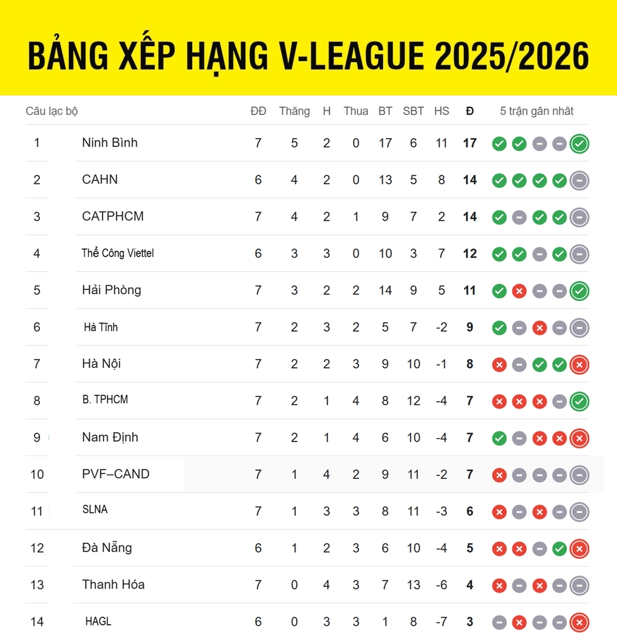 Bảng xếp hạng V-League mới nhất, nhóm đầu căng thẳng với khoảng cách không quá xa trong khi HAGL đang tạm thời xếp cuối.