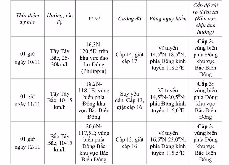 Cảnh báo trong khoảng ngày 10 - 12/11, vùng biển phía đông khu vực bắc Biển Đông có khả năng chịu tác động của gió bão mạnh cấp 11 - 13, giật cấp 16, sóng biển cao 8 - 10m. Biển động dữ dội.