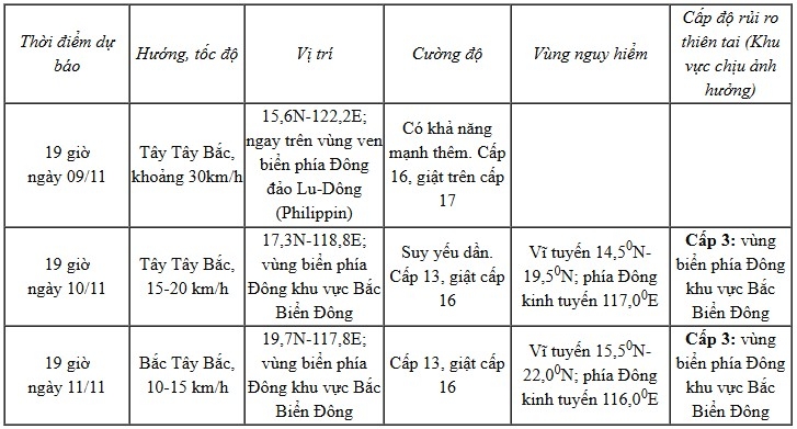 Trong khoảng ngày 10 - 12/11, vùng biển phía Đông khu vực Bắc Biển Đông có khả năng chịu tác động của gió bão mạnh cấp 11 - 13, giật cấp 16, sóng biển cao 8,0 - 10,0m. Biển động dữ dội.