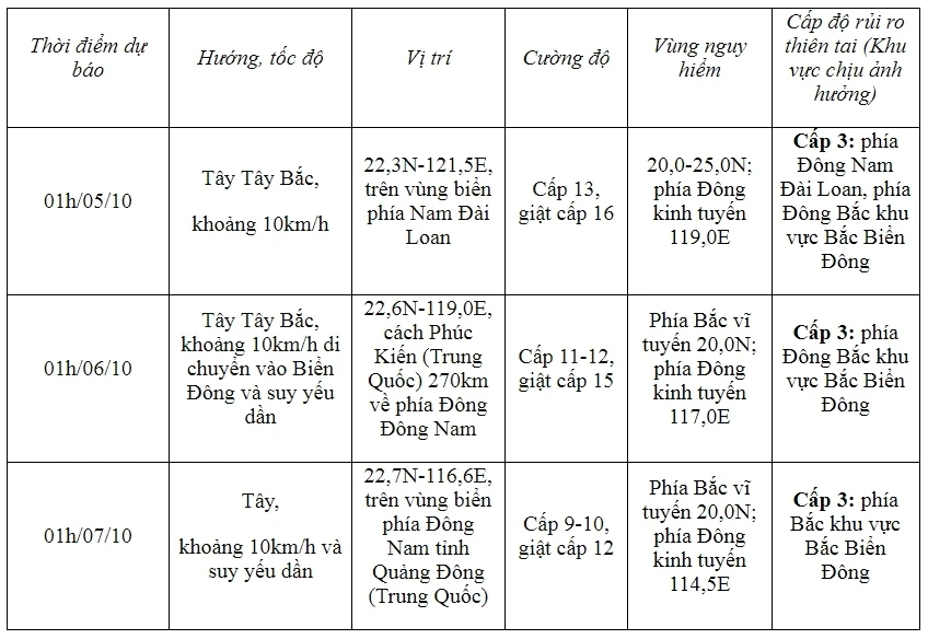 Dự báo, do tác động của bão, vùng biển phía Đông Bắc của khu vực Bắc Biển Đông có gió mạnh cấp 6-7, từ đêm 4/10 mạnh lên cấp 8-10, vùng gần tâm bão đi qua cấp 11-12, giật cấp 15; biển động dữ dội.