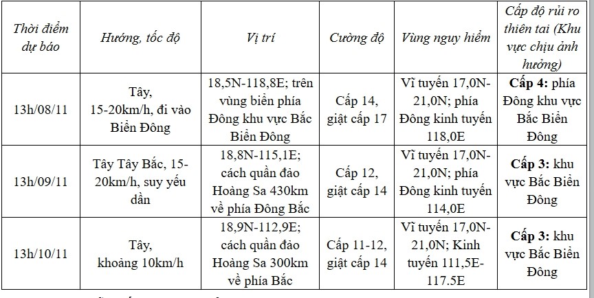 Theo Trung tâm Dự báo khí tượng thủy văn quốc gia, hồi 13 giờ ngày 7/11, vị trí tâm bão ở vào khoảng 18,5 độ Vĩ Bắc; 122,4 độ Kinh Đông, trên vùng biển phía Đông Bắc đảo Lu Dông (Philippines).