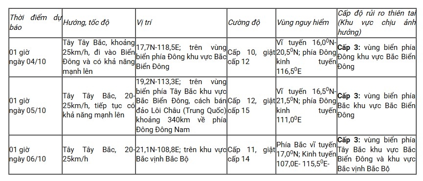 Trên biển: Từ trưa và chiều 3/10, vùng biển phía Đông khu vực Bắc Biển Đông có gió mạnh dần lên cấp 6 - 7; sau tăng lên cấp 8-9, vùng gần tâm bão đi qua mạnh cấp 10 - 11, giật cấp 13, sóng biển cao 4,0-6,0m. Biển động dữ dội.