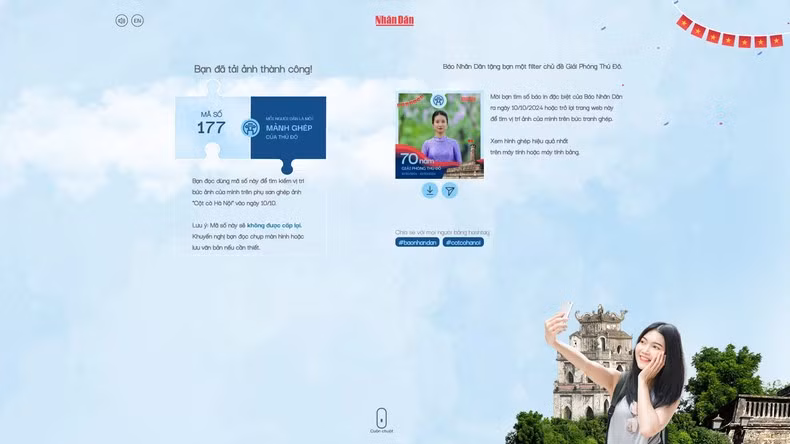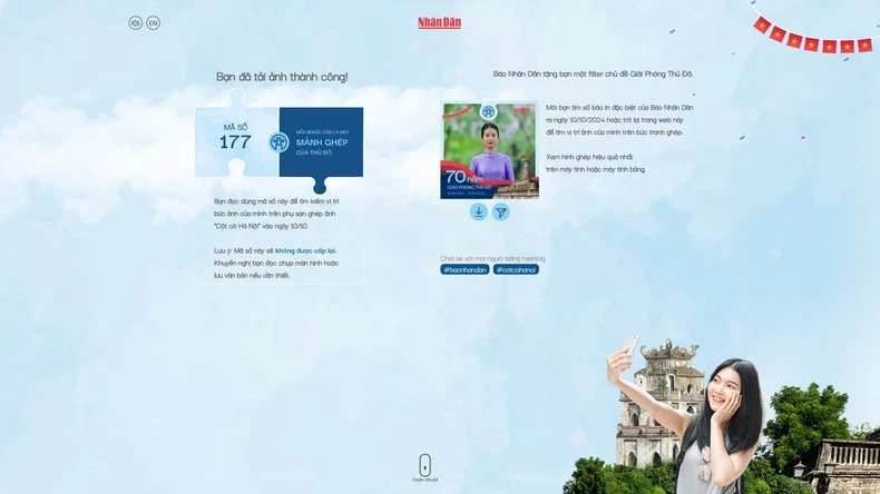 Bước 4: Chia sẻ filter 70 năm Giải phóng Thủ đô với hashtag #baonhandan #cotcohanoi