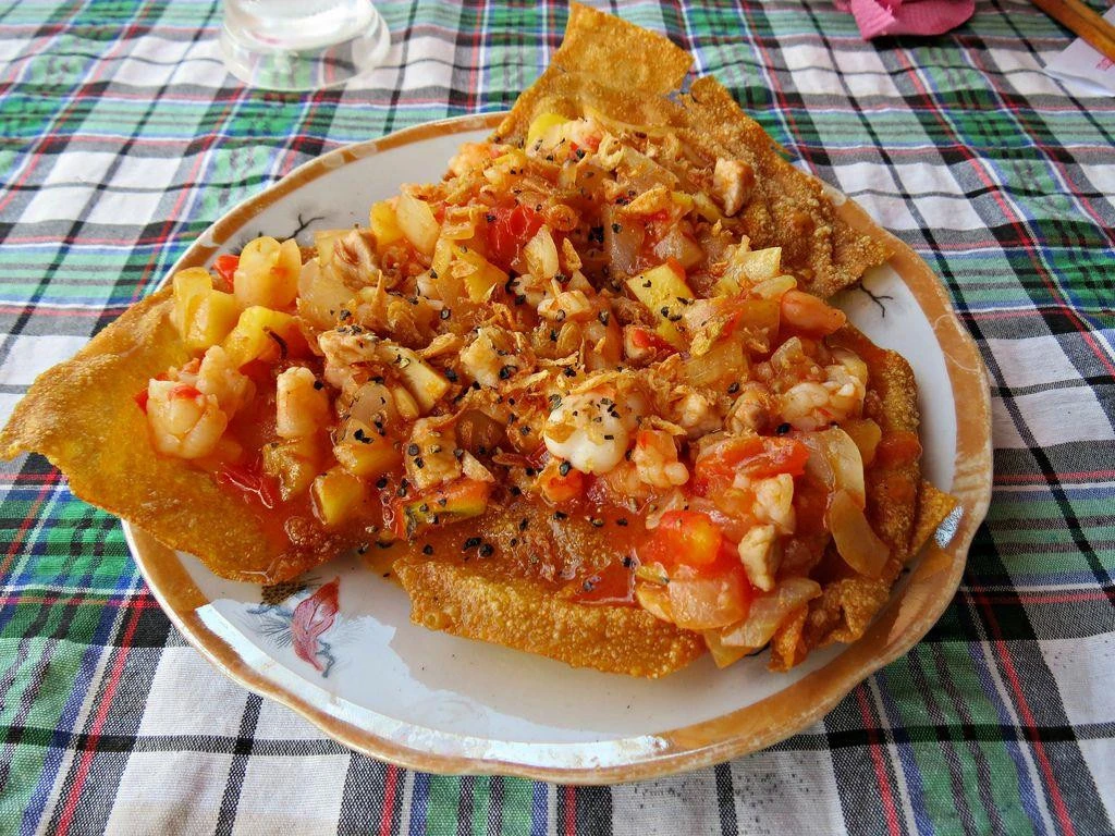 Một món ăn khác xuất hiện là hoành thánh chiên giòn. Món hoành thánh được phủ tôm tươi và salsa xoài chua ngọt.