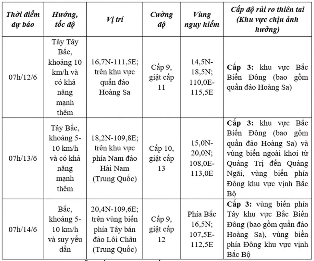 Trên biển: Khu vực Bắc Biển Đông (bao gồm vùng biển quần đảo Hoàng Sa), phía Bắc khu vực Giữa Biển Đông có mưa giông và gió mạnh cấp 6-7, vùng gần tâm bão đi qua cấp 8-9, giật cấp 11, sóng biển cao 3,0-5,0m, biển động rất mạnh; phía Nam khu vực Giữa Biển Đông, khu vực Nam Biển Đông (bao gồm vùng biển quần đảo Trường Sa) có gió Tây Nam mạnh cấp 6, có lúc cấp 7, giật cấp 8-9, sóng biển cao 2,0-4,0m, biển động mạnh.