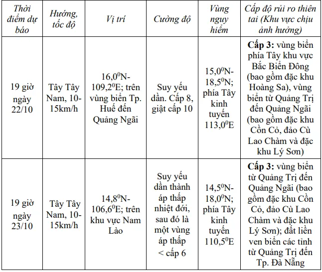 Vùng biển từ Quảng Trị đến Quảng Ngãi (bao gồm đặc khu Cồn Cỏ, đảo Cù Lao Chàm và đặc khu Lý Sơn) có gió mạnh cấp 6, từ gần sáng ngày 22/10 tăng lên cấp 7, vùng gần tâm bão đi qua cấp 8, giật cấp 10, sóng biển cao 3 - 5 m, biển động mạnh.