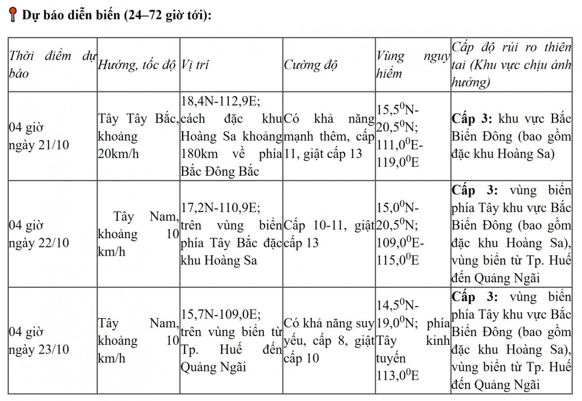 Hồi 04 giờ ngày 20/10, vị trí tâm bão ở vào khoảng 17,5 độ Vĩ Bắc; 117,2 độ Kinh Đông, cách đặc khu Hoàng Sa khoảng 540km về phía Đông Đông Bắc.