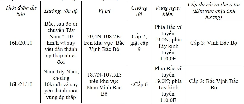 Hồi 16h ngày 19/10, vị trí tâm bão ở vào khoảng 20,3 độ Vĩ Bắc; 108,7 độ Kinh Đông, trên vùng biển phía Đông Vịnh Bắc Bộ. Sức gió mạnh nhất vùng gần tâm bão mạnh cấp 8 (62-74km/giờ), giật cấp 10. Di chuyển theo hướng Bắc với tốc độ khoảng 10km/h.