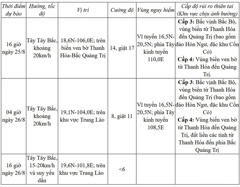 Trên đất liền: Từ sáng 25/8, trên đất liền từ Thanh Hóa đến Bắc Quảng Trị có gió mạnh dần lên cấp 8-11, giật cấp 12-14. Riêng khu vực Nam Thanh Hóa-Hà Tĩnh có gió mạnh cấp 12-14, giật cấp 15-16, vùng ven biển các tỉnh từ Quảng Ninh đến Ninh Bình có gió mạnh dần lên cấp 6-8, giật cấp 9-10.