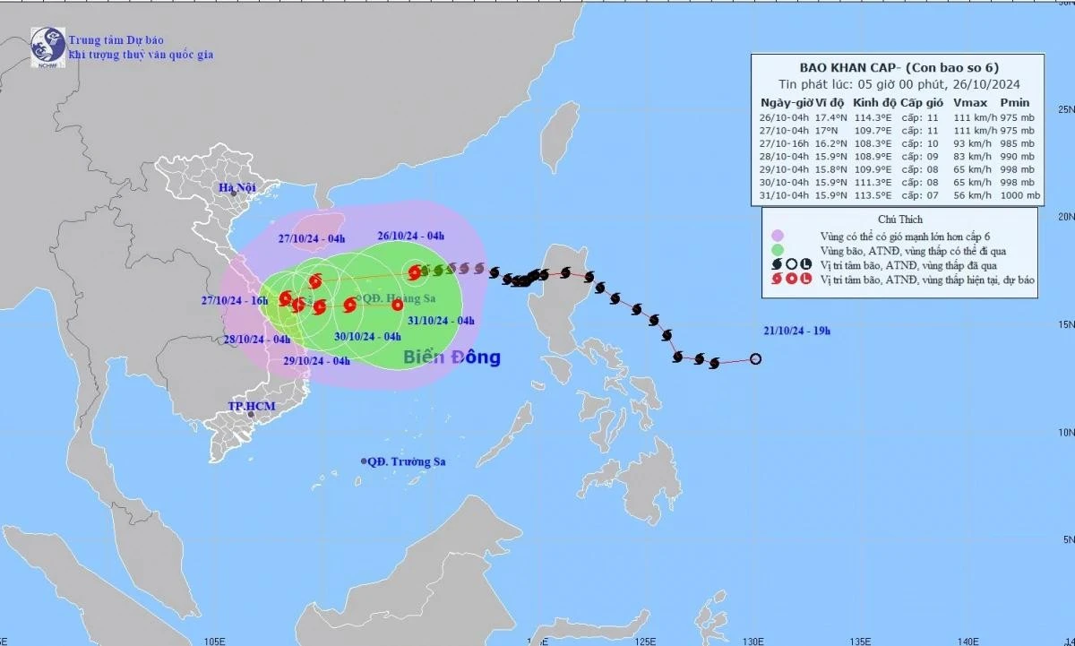 Theo Trung tâm Khí tượng Thủy văn Quốc gia, hồi 4h ngày 26/10, vị trí tâm bão ở vào khoảng 17,4 độ Vĩ Bắc; 114,3 độ Kinh Đông, trên khu vực Bắc Biển Đông, cách quần đảo Hoàng Sa khoảng 230km về phía Đông Đông Bắc. Sức gió mạnh nhất vùng gần tâm bão mạnh cấp 11 (103-117km/h), giật cấp 14. Di chuyển theo hướng Tây, tốc độ khoảng 20km/h.