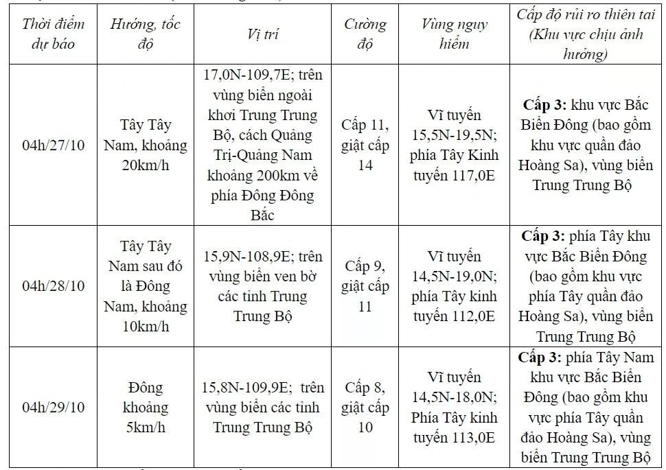 Từ đêm 26/10, vùng biển các tỉnh từ Quảng Bình đến Quảng Ngãi (bao gồm đảo Cồn Cỏ, Cù Lao Chàm, Lý Sơn) có gió mạnh dần lên cấp 6-7, sau tăng lên cấp 8-9, vùng gần tâm bão đi qua cấp 10-11, giật cấp 14, sóng biển cao 3,0-5,0m, vùng gần tâm bão 5,0-7,0m; biển động dữ dội.
