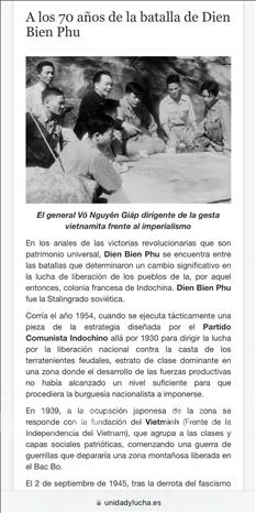 Bài viết “70 năm sau trận Điện Biên Phủ” trên Báo Unidad y Lucha (Thống nhất và Đấu tranh), cơ quan ngôn luận của Đảng Cộng sản Nhân dân Tây Ban Nha (PCPE).