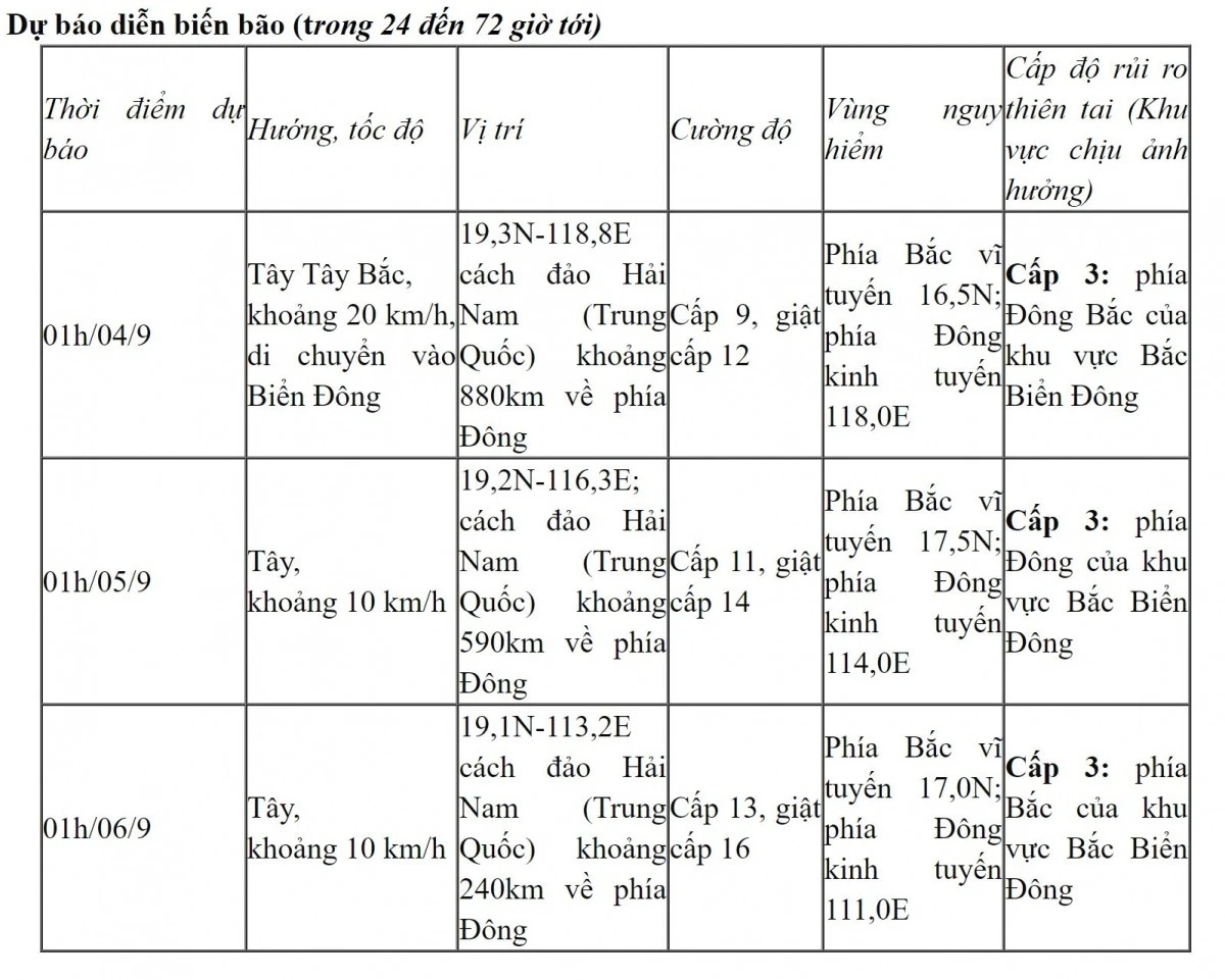 Từ 72 đến 120 giờ tiếp theo, bão di chuyển chủ yếu theo hướng Tây, mỗi giờ đi được 10km, cường độ có khả năng mạnh thêm. Dự báo khoảng chiều và đêm 3/9 bão YAGI đi vào Biển Đông. Từ trưa và chiều 3/9 vùng biển phía Đông Bắc của khu vực Bắc Biển Đông gió mạnh dần lên cấp 6, vùng gần tâm bão mạnh cấp 8, giật trên cấp 11; biển động mạnh. Dự báo trong khoảng từ 4-6/9 bão YAGI có thể đạt cấp bão rất mạnh trên khu vực Đông Bắc Biển Đông, gió mạnh tối đa có thể lên tới cấp 12-13, giật cấp 16 vùng gần tâm bão.