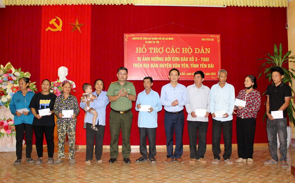 Lãnh đạo Báo Công an thành phố Hồ Chí Minh và Báo Yên Bái trao hỗ trợ cho các hộ dân bị ảnh hưởng bởi cơn bão số 3 trên địa bàn huyện Văn Yên.