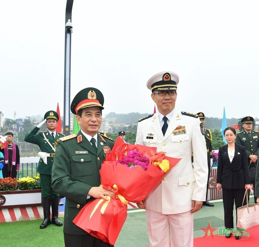 Bộ trưởng Đổng Quân chủ trì Lễ đón Bộ trưởng Phan Văn Giang và Đoàn đại biểu cấp cao Bộ Quốc phòng Việt Nam tại Cửa khẩu Hà Khẩu. Ảnh: TRỌNG HẢI