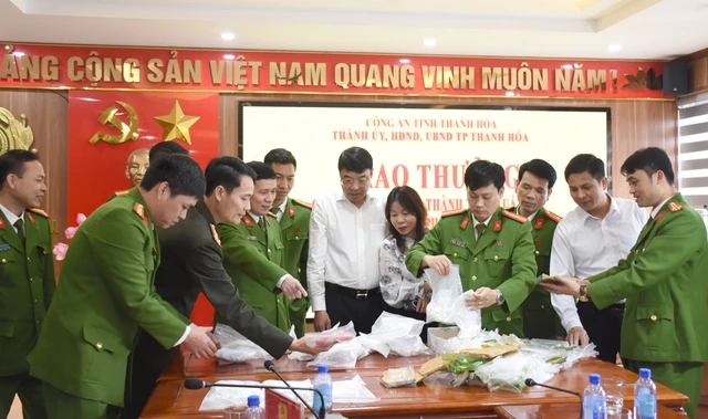 Chiều 21/2, Công an tỉnh Thanh Hóa và UBND TP Thanh Hóa đã tổ chức tuyên dương, trao thưởng tổng số tiền 130 triệu đồng cho Phòng Cảnh sát điều tra tội phạm về ma túy Công an tỉnh Thanh Hóa và Công an TP Thanh Hóa về thành tích xuất sắc trong đấu tranh, triệt phá 2 chuyên án vận chuyển ma túy "khủng".