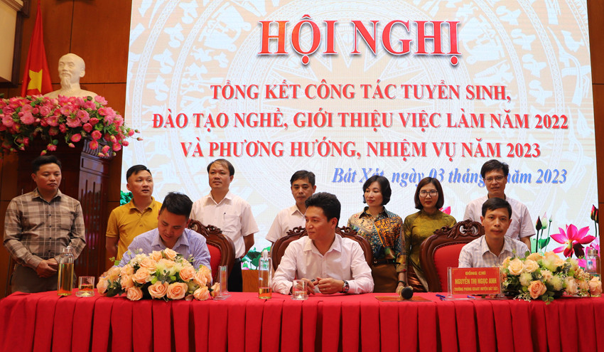 Tại hội nghị, huyện Bát Xát đã tổ chức ký cam kết trách nhiệm thực hiện chỉ tiêu tuyển sinh và công tác dạy nghề, giới thiệu việc làm năm 2023 với chủ tịch UBND các xã, thị trấn, Phòng Giáo dục và Đào tạo, Phòng Lao động – Thương binh & Xã hội, hiệu trưởng các trường trên địa bàn huyện (ảnh trên).
