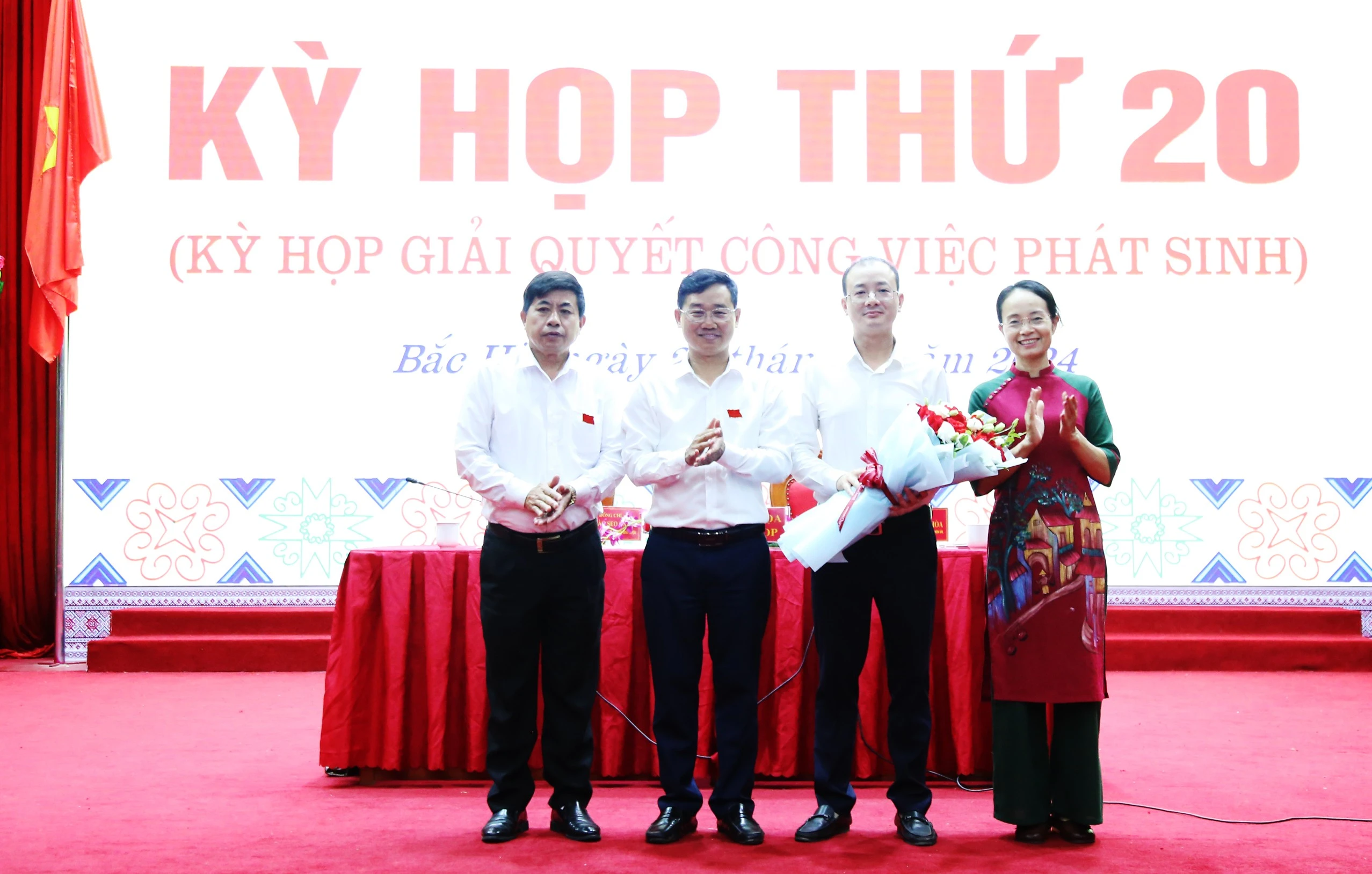 Đồng chí Nguyễn Trọng Hài, Phó Chủ tịch UBND tỉnh tặng hoa chúc mừng đồng chí Đặng Công Hải được bầu giữ chức Chủ tịch UBND huyện Bắc Hà.