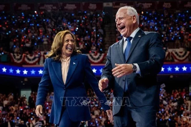 Phó Tổng thống Mỹ Kamala Harris (trái) và Thống đốc bang Minnesota Tim Walz tại chiến dịch vận động tranh cử ở Philadelphia, Pennsylvania, Mỹ, ngày 6/8/2024. Ảnh: Getty Images/TTXVN