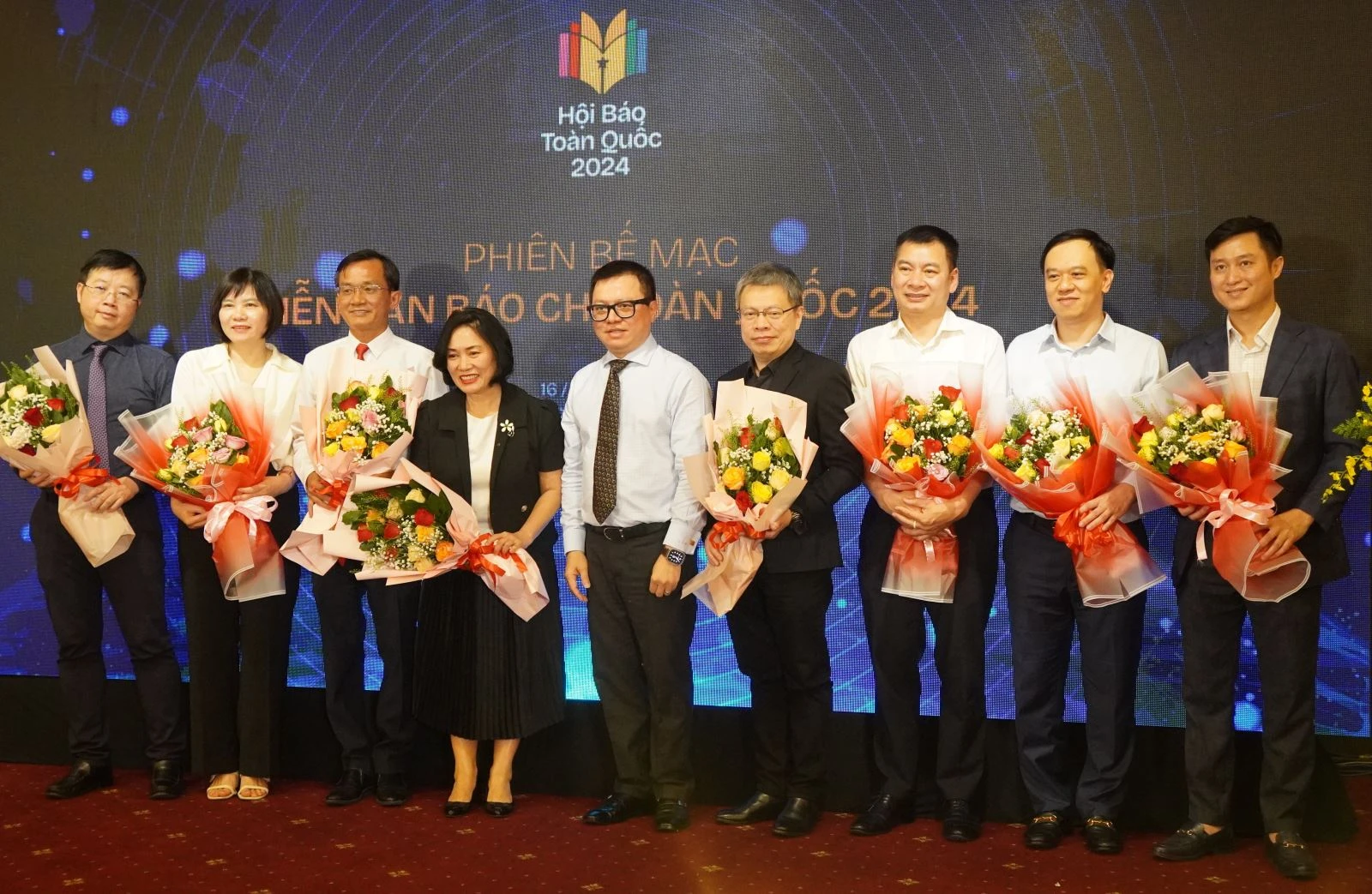 Đại diện Ban tổ chức tặng hoa cảm ơn cho các điều phối của 10 phiên Diễn đàn báo chí toàn quốc năm 2024.