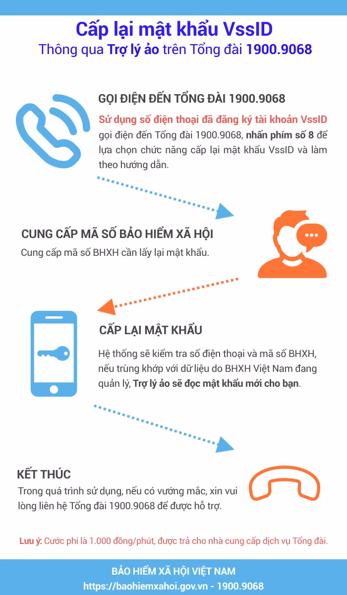 Bước 1: Người dùng sử dụng số điện thoại đã đăng ký tài khoản VssID gọi điện đến Tổng đài 1900.9068, nhấn phím số 8 để lựa chọn chức năng cấp lại mật khẩu VssID và làm theo hướng dẫn.