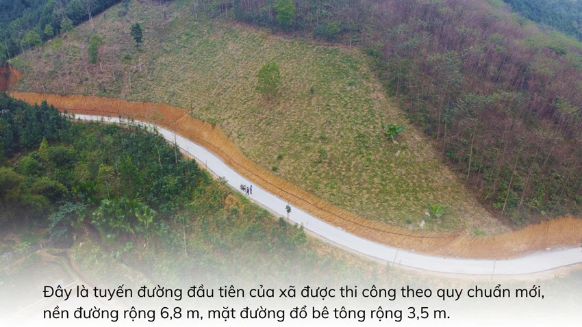 Đưa chúng tôi đi tham quan thôn trên con đường nông thôn mới nối từ thôn 7 Vành đến thôn 3 Thâu vừa được trải bê tông phẳng phiu, uốn lượn qua những đồi quế, mỡ, Bí thư Hoàng Văn Mười không giấu được tự hào, bởi đây là tuyến đường đầu tiên của xã được thi công theo quy chuẩn mới, nền đường rộng 6,8 m, mặt đường đổ bê tông rộng 3,5 m. Với nền đường rộng như vậy, những chiếc xe tải vào thu mua nông - lâm sản có thể đến tận chân đồi, giảm tiền cước vận chuyển, góp phần tăng thu nhập cho bà con.