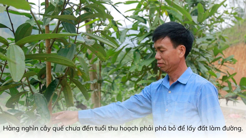 Đứng trên đoạn đường vừa được đổ bê tông, chỉ tay lên phía taluy cao quá đầu, nơi có những cây quế mới 2 năm tuổi đang nằm ngổn ngang bên vệt gầu máy xúc quét qua, Bí thư Hoàng Văn Mười bảo, dọc tuyến đường có hàng nghìn cây quế chưa đến tuổi thu hoạch phải phá bỏ để lấy đất làm đường. Thôn đã họp và thống nhất bà con rồi, đường mở đến đâu thì hiến đất đến đấy. Nhìn những cây quế đang tuổi “nhỡ”, chỉ chặt bỏ, không tận dụng được vào việc gì, ai cũng tiếc, nhưng giờ nhìn tuyến đường thênh thang, sạch đẹp hơn cả đường trục chính vào xã thì ai cũng phấn khởi.