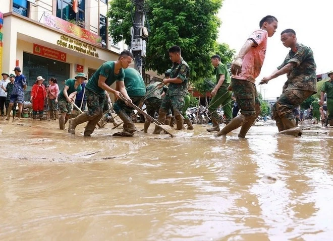 Bộ đội giúp Nhân dân thành phố Yên Bái dọn bùn đất sau lũ quét.