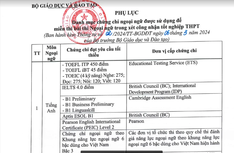 Bên cạnh chứng chỉ quen thuộc như: IELTS, TOEFL, năm 2024, thí sinh có chứng chỉ B1, TOEIC bốn kỹ năng, Aptis ESOL... đạt yêu cầu sẽ được tính 10 điểm tiếng Anh và miễn thi tốt nghiệp môn này.