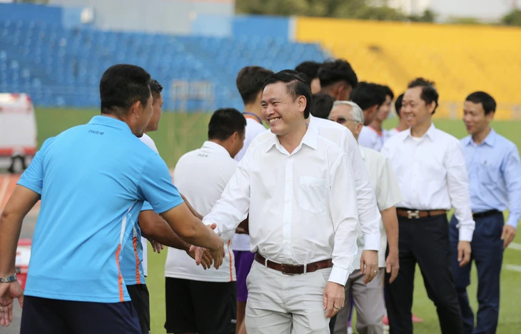 Phó chủ tịch VFF Trần Anh Tú bắt tay HLV Nguyễn Quốc Tuấn (U19 B.Bình Dương) sau lễ khai mạc.