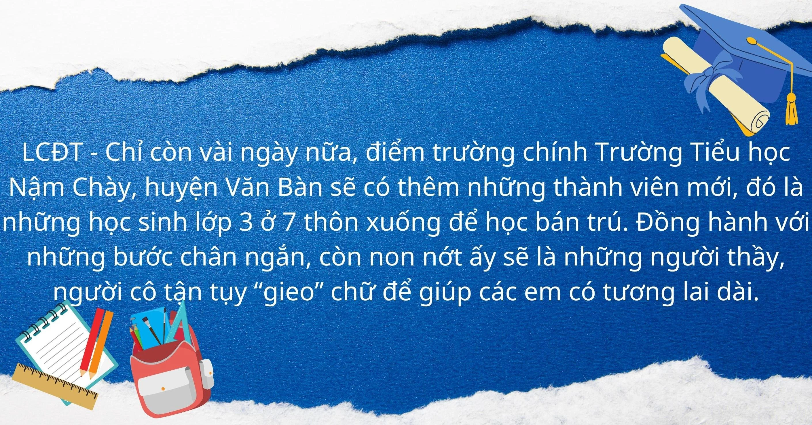 Chia tay các thầy cô và học sinh nhà trường, câu hát “hôm nay đi học xa, đường tương lai đường gần...” của học sinh đang tập luyện cho lễ khai giảng vang lên. Chúng tôi tin rằng, với sự đồng hành của những người thầy, người cô, hành trình “tìm con chữ” của những em nhỏ vùng cao Nậm Chày sẽ được rút ngắn và bớt nhọc nhằn hơn.