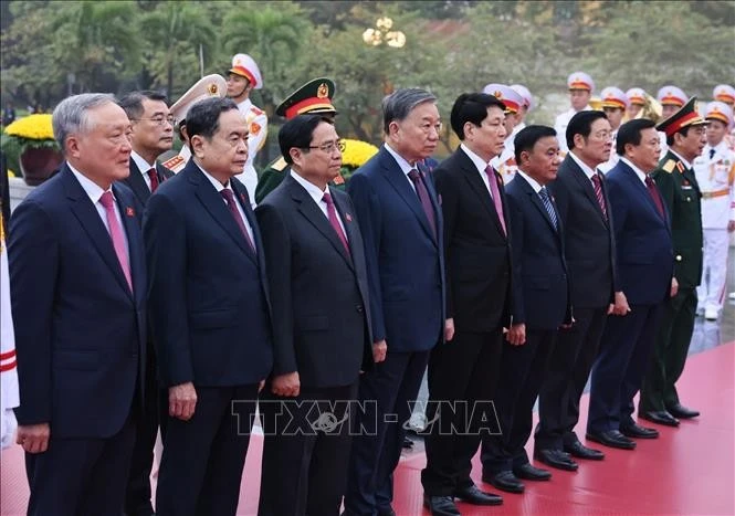 Sáng 19/1, trước giờ khai mạc phiên họp trù bị Đại hội đại biểu toàn quốc lần thứ XIV của Đảng, các đồng chí Ủy viên Bộ Chính trị: Tổng Bí thư Tô Lâm, Chủ tịch nước Lương Cường, Thủ tướng Chính phủ Phạm Minh Chính, Chủ tịch Quốc hội Trần Thanh Mẫn, Thường trực Ban Bí thư Trần Cẩm Tú; Bí thư Trung ương Đảng, Chủ tịch Ủy ban Trung ương Mặt trận Tổ quốc Việt Nam Bùi Thị Minh Hoài cùng các đồng chí Ủy viên Bộ Chính trị, Bí thư Trung ương Đảng và đại biểu dự Đại hội đại biểu toàn quốc lần thứ XIV của Đảng đã đặt hoa, vào Lăng viếng Chủ tịch Hồ Chí Minh - Người sáng lập và rèn luyện Đảng ta, lãnh tụ vĩ đại của Đảng và dân tộc Việt Nam.