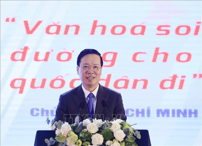 Bày tỏ tình cảm, niềm vui được gặp gỡ các nhà văn lão thành, trong đó rất nhiều “nhà văn chiến sĩ”, đi qua các cuộc kháng chiến đầy gian khổ, hy sinh, sáng tạo nên những tác phẩm mang dấu ấn thời đại, như những “đoàn quân” đặc biệt với sức mạnh tinh thần Việt Nam bất diệt, góp phần quan trọng vào chiến thắng chung của dân tộc, Chủ tịch nước Võ Văn Thưởng xúc động tưởng nhớ và tri ân các nhà văn đã mất, đặc biệt là các nhà văn, nhà thơ đã hy sinh trong các cuộc kháng chiến vĩ đại cho độc lập, tự do và thống nhất đất nước… Nhắc lại Hội nghị văn hóa toàn quốc tháng 11 năm 1946, Chủ tịch Hồ Chí Minh đã nói: “Văn hóa soi đường quốc dân đi” và 75 năm sau, tại Hội nghị văn hóa toàn quốc tháng 11/2021, Tổng Bí thư Nguyễn Phú Trọng tiếp tục khẳng định: “Văn hóa còn là dân tộc còn”, Chủ tịch nước Võ Văn Thưởng nhấn mạnh, điều đó cho thấy, văn hóa là sự sống còn của một dân tộc. Nếu không có văn hóa thì mỗi con người và mỗi dân tộc ở bất kỳ nơi đâu, ở bất kỳ thời đại nào cũng không thể tìm thấy mục đích và giá trị sống chân chính của mình. Trong đó, văn học là một trong những thành tố vô cùng quan trọng làm nên vẻ đẹp của văn hóa Việt Nam, lan tỏa vẻ đẹp ấy trong đời sống, đánh thức tình yêu và trách nhiệm của mỗi người Việt Nam với Tổ quốc của mình.