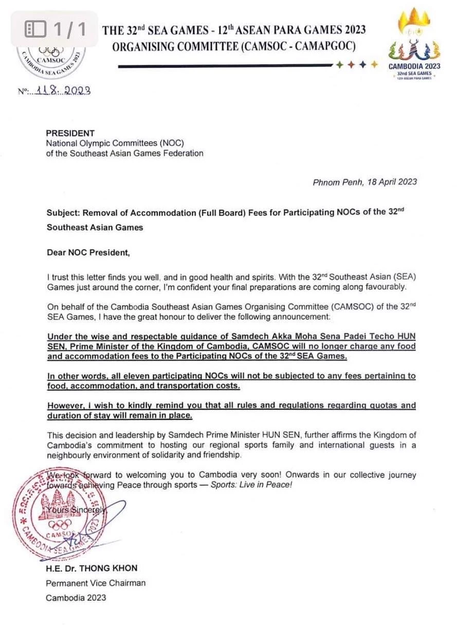 Cụ thể, quyết định từ Campuchia nêu rõ: "SEA Games 32 đang bước vào giai đoạn chuẩn bị cuối cùng để hướng tới kỳ Đại hội thành công tốt đẹp. Ủy ban Olympic Campuchia không thu phí ăn, ở và giao thông đi lại đối với các đoàn thể thao dự SEA Games 32".