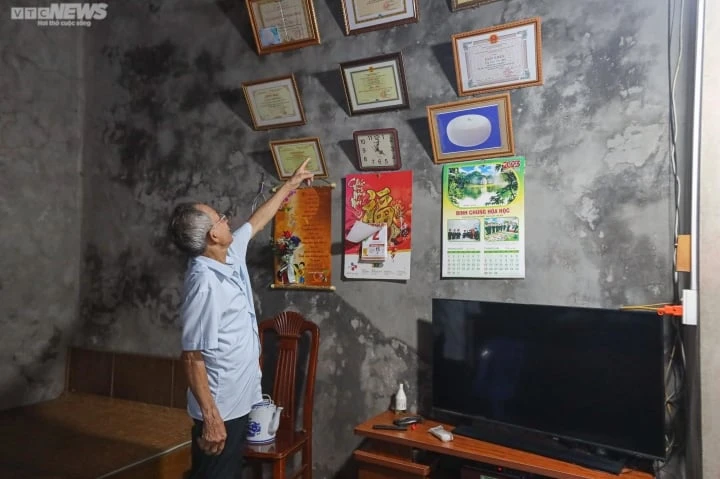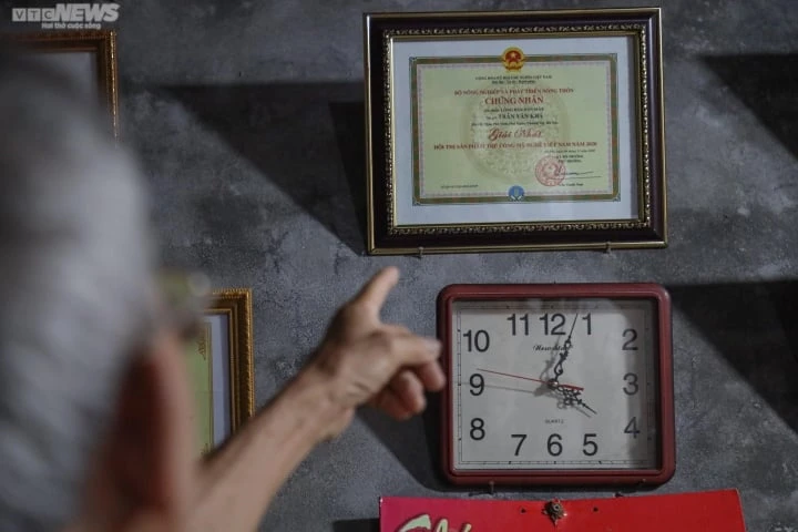 Ông Khá giới thiệu về những kỉ niệm và những thành tựu đạt được nhờ chiếc lồng bàn thủ công do hai vợ chồng sáng tạo làm ra.