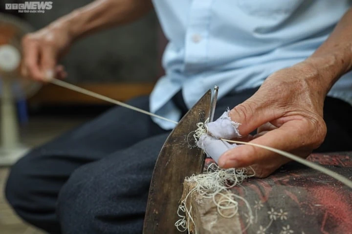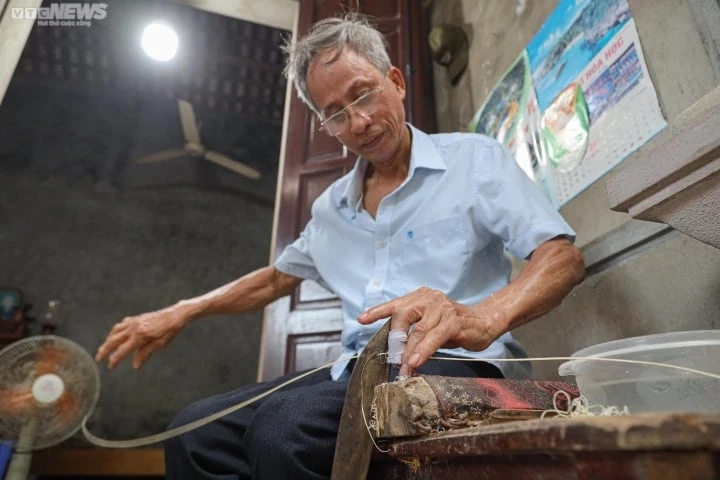 Ông Khá đang chuốt sợi mây cho mỏng, mịn như tờ poluya và nhỏ như sợi chỉ để đan lồng bàn, từng động tác tỉ mỉ, cẩn thận chứng tỏ ông rất lành nghề.