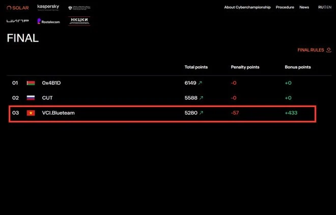 Sự phối hợp nhuần nhuyễn, chiến lược điều phối thông minh và khả năng ứng biến linh hoạt, tại chung kết, VNPT Cyber Immunity đã làm nên kỳ tích khi xuất sắc giành thành tích TOP 3 chung cuộc, đánh dấu một cột mốc mới của VCI nói riêng và VNPT nói chung tại đấu trường an ninh mạng lớn trên thế giới.