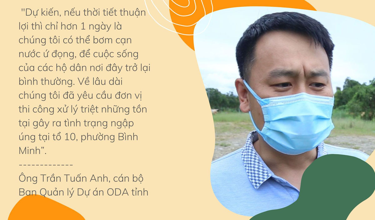 Được biết, tình trạng ngập úng tại tổ 10, phường Bình Minh xảy ra từ khi xây dựng tuyến đường D1 (đường Võ Nguyên Giáp), đoạn từ Bến xe Trung tâm đến Bệnh viện Đa khoa tỉnh. Hiện, hệ thống cống thoát nước từ khu dân cư tổ 10 dẫn qua đường D1 ra suối Ngòi Đường đã bị tắc do đất đá vùi lấp. Trước những kiến nghị, phản ánh của người dân, Ban Quản lý Dự án ODA tỉnh (chủ đầu tư) đã chỉ đạo đơn vị thi công Dự án san gạt mặt bằng hai bên đường D1 bố trí máy xúc, máy bơm và công nhân đến khắc phục tình trạng ngập úng tại tổ 10, phường Bình Minh. Ông Trần Tuấn Anh, cán bộ Ban Quản lý Dự án ODA tỉnh cho biết: Chúng tôi đã chỉ đạo đơn vị thi công bố trí công nhân trực 24/24 giờ để bơm nước giải quyết tình trạng ngập úng khu vực tổ 10, phường Bình Minh. Dự kiến, nếu thời tiết thuận lợi thì chỉ hơn 1 ngày là chúng tôi có thể bơm cạn nước ứ đọng, để cuộc sống của các hộ dân nơi đây trở lại bình thường. Về lâu dài chúng tôi đã yêu cầu đơn vị thi công xử lý triệt những tồn tại gây ra tình trạng ngập úng tại tổ 10, phường Bình Minh.
