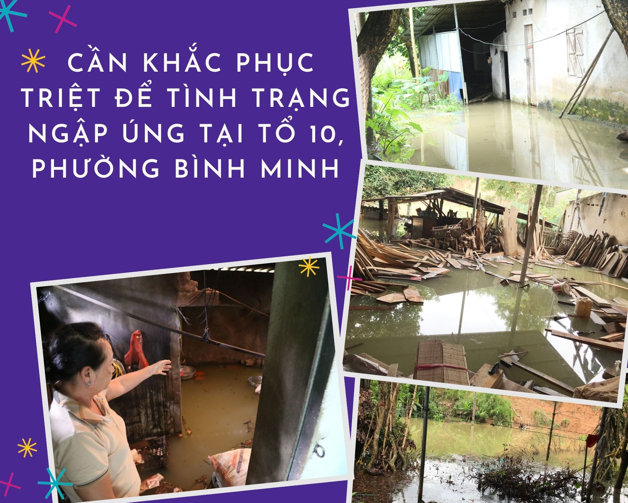 Trận mưa lớn đêm 13, rạng sáng 14/6 đã khiến khu bếp và nhà vệ sinh của gia đình bà Nguyễn Thị Hiền, tổ 10, phường Bình Minh ngập sâu gần 1 mét nước. Nhiều vật dụng sinh hoạt hàng ngày của gia đình bà Hiền như xoong, nồi, chậu, ghế nhựa… và rác trôi nổi khắp gian bếp. Bà Hiền cho biết: Nước ngập đã khiến khu vực đun bếp củi và khu vệ sinh không thể sử dụng, cuộc sống của gia đình tôi bị đảo lộn. Nhà tôi làm đậu phụ bán, nên từ khi bếp bị ngập nước là không làm được gì, đồng nghĩa với không có thu nhập.