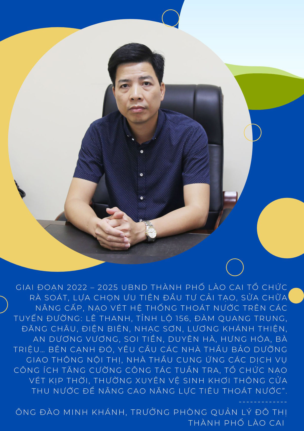 Ông Đào Minh Khánh, Trưởng phòng Quản lý đô thị thành phố Lào Cai cho biết: Giai đoạn 2022 – 2025, UBND thành phố Lào Cai tổ chức rà soát, lựa chọn ưu tiên đầu tư cải tạo, sửa chữa nâng cấp, nạo vét hệ thống thoát nước trên các tuyến đường: Lê Thanh, Tỉnh lộ 156, Đàm Quang Trung, Đăng Châu, Điện Biên, Nhạc Sơn, Lương Khánh Thiện, An Dương Vương, Soi Tiền, Duyên Hà, Hưng Hóa, Bà Triệu… Bên cạnh đó, yêu cầu các nhà thầu bảo dưỡng giao thông nội thị, nhà thầu cung ứng các dịch vụ công ích tăng cường công tác tuần tra, tổ chức nạo vét kịp thời, thường xuyên vệ sinh khơi thông cửa thu nước để nâng cao năng lực tiêu thoát nước.