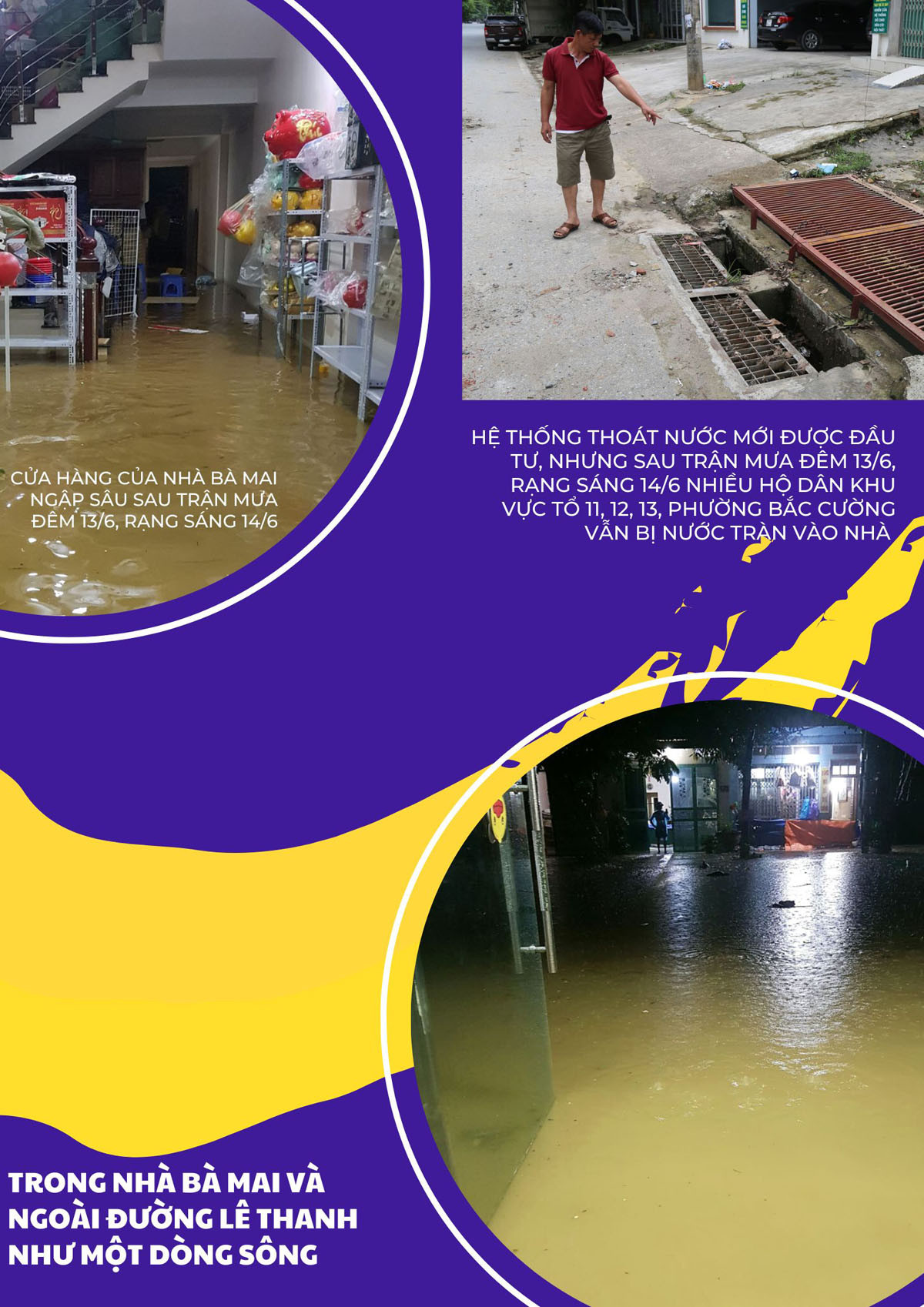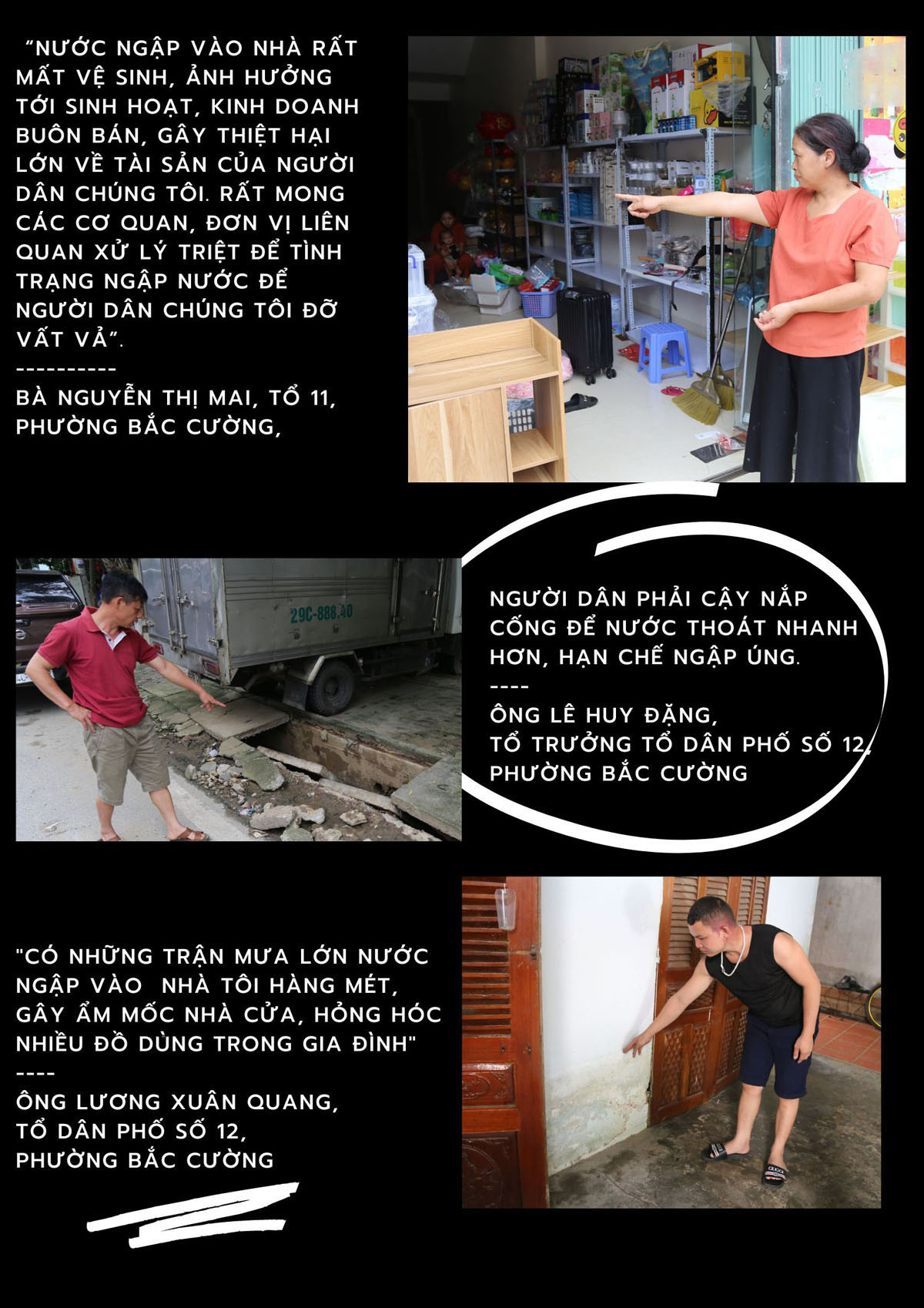 Cửa hàng tạp hóa của gia đình bà Nguyễn Thị Mai, tổ 11, phường Bắc Cường, thành phố Lào Cai nằm ở đoạn trũng nhất đường Lê Thanh. Trận mưa đêm 13/6, rạng sáng 14/6 vừa qua cả gia đình bà Mai phải vất vả chuyển hết các mặt hàng lên gác xép để tránh thiệt hại. Bà Mai thở dài, nói: Nước ngập vào nhà rất mất vệ sinh, ảnh hưởng tới sinh hoạt, kinh doanh buôn bán, gây thiệt hại lớn về tài của gia đình tôi. Rất mong các cơ quan, đơn vị liên quan xử lý triệt để tình trạng ngập nước để người dân chúng tôi đỡ vất vả.