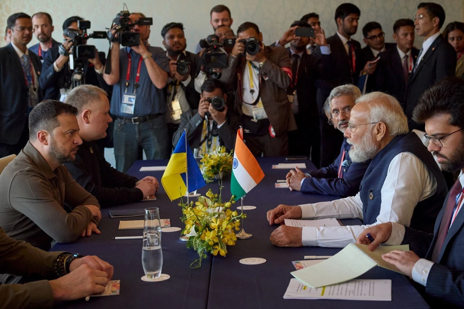 Thủ tướng Ấn Độ Narendra Modi (thứ 2, phải) và Tổng thống Ukraine Volodymyr Zelensky (trái) tại cuộc gặp bên lề Hội nghị thượng đỉnh G7 ở Hiroshima, Nhật Bản, ngày 20/5/2023.